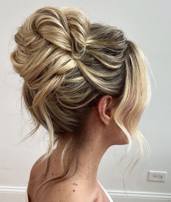 Hair by @EmilyRaeBridalHair Piled High: High buns are back. Taking inspiration from the iconic Pamela Anderson look, infusing it with modern flair and plenty of texture. This trend sees brides opting for voluminous, textured buns positioned high on the crown, creating a striking silhouette that commands attention. The elevated position of the bun allows for effortless veil attachment, ensuring a seamless and elegant transition from ceremony to reception.